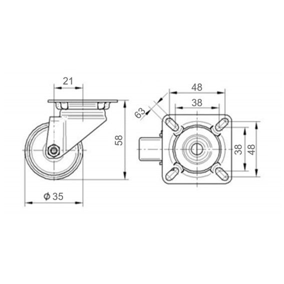 Wieldiameter 35 mm Bouwhoogte 58 mm Rijdend draagvermogen 100 KG Vork materiaal Geperst staal (verzinkt) Vork lager Dubbele kogeldraaikrans Band materiaal Polyurethaan Band hardheid Shore D 40 Band breedte 25 mm Velg materiaal Polypropyleen met kogellager Wielas type Metalen as, bout bevestiging Temperatuur -10/ +40°C Zwenkradius 35 mm Eigen gewicht 0,22KG Keuringsnorm EN 12532 Garantie 5 jaar Top kwaliteit zwenkwiel