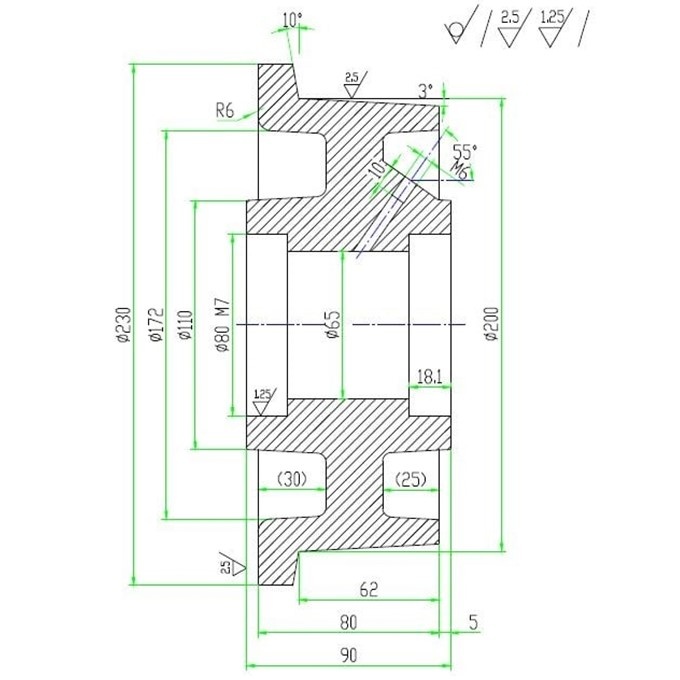 Velgenmateriaal: Hoogwaardig gietijzer. De spoorkrans en het loopvlak zijn zuiver afgedraaid. Het loopvlak loopt onder een hoek van 3 graden af van de spoorkrans.