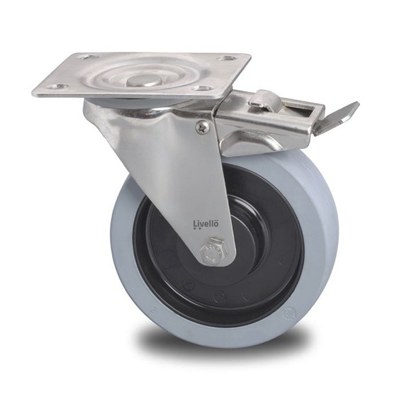 Livellö zwenkwiel RVS 125 elastisch rubber plaat met rem