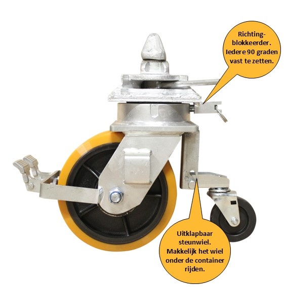 Zeer geschikt voor het verplaatsen van zeecontainers en ISO containers. Deze zwaarlastwielen kunnen onder containers geplaats worden door middel van de ISO twistlock die boven op het wiel gemonteerd is. Dit wiel is voorzien van een steunwiel waardoor u makkelijk het complete wiel onder de container kunt rijden. Na plaatsing onder de container klapt u het steunwiel op. Door middel van de hendel die er aan vast zit kunt u het wiel verankeren onder de container in de corner castings (op de hoeken van de container). Doordat het een dubbel wiel is heeft u een betere drukverdeling en rolweerstand met het verrijden.