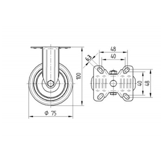 Wieldiameter 75 mm Bouwhoogte 100 mm Rijdend draagvermogen 110 KG Vork materiaal Geperst staal (verzinkt) Band materiaal Niet-strepende thermoplastische rubberband Band hardheid Shore A 87 Band breedte 25 mm Velg materiaal Polypropyleen met glijlager Wielas type Metalen as, bout bevestiging Temperatuur -20/ +60°C Eigen gewicht 0,242 KG Keuringsnorm EN 12532 Garantie 5 jaar Top kwaliteit bokwiel