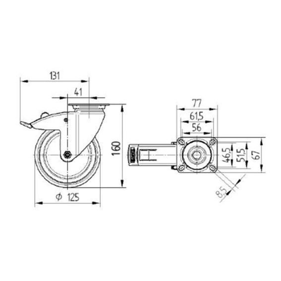 Wieldiameter 125 mm Bouwhoogte 160 mm Rijdend draagvermogen 150 KG Vork materiaal Geperst staal (verzinkt) Vork lager Dubbele kogeldraaikrans Soort rem Dubbel, wiel - draaikrans Band materiaal Niet-strepende thermoplastische rubberband Band hardheid Shore A 87 Band breedte 32 mm Velg materiaal Polypropyleen met precisiekogellager, draadvangkappen Wielas type Metalen as, bout bevestiging Temperatuur -20/ +60°C Zwenkradius 131 mm Eigen gewicht 0,941 KG Keuringsnorm EN 12532 Garantie 5 jaar Top kwaliteit zwenkwiel