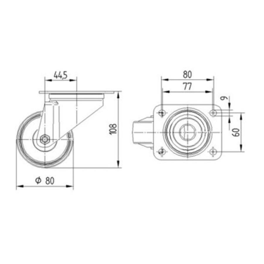 Wieldiameter 80 mm Bouwhoogte 108 mm Rijdend draagvermogen per wiel 100 kg Stilstaand draagvermogen per wiel 200 kg Vork materiaal Roestvrijstaal Vork lager Dubbele kogeldraaikrans Band materiaal Gespoten polyurethaan Band hardheid Shore D 42 Band breedte 32 mm Velg materiaal Polyamide met RVS rollager Wielas type RVS metalen as, bout bevestiging Temperatuur -40/ +80°C Zwenkradius 84,5 mm Eigen gewicht 0,718 KG Keuringsnorm EN 12532 Garantie 5 jaar 8470UAD080P62 blue Let op, de foto wijkt af van de werkelijkheid. Op de foto ziet u de 100mm variant.
