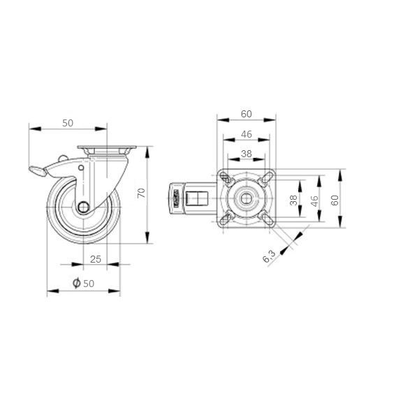 Wieldiameter 50 mm Bouwhoogte 70 mm Rijdend draagvermogen 40 KG Vork materiaal Geperst staal (verzinkt) met zwarte poedercoating Vork lager Dubbele kogeldraaikrans Rem type Dubbel geremd (wiel + draaikrans) Band materiaal Niet-strepende thermoplastische rubberband zwart Band hardheid Shore A 85 Band breedte 19 mm Velg materiaal Polypropyleen met glijlager Wielas type Metalen as, bout bevestiging Bevestiging Plaat bevestiging Temperatuur -20/ +60°C Zwenkradius 80 mm Eigen gewicht 0.27 KG Garantie 5 jaar -